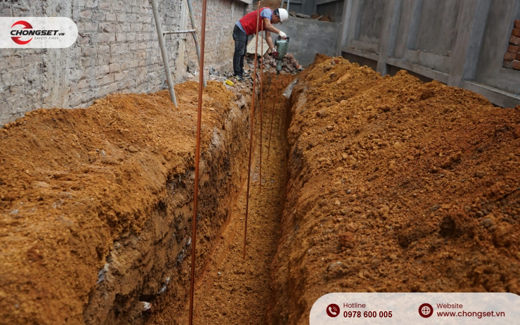 - Bước 1: Tính số lượng cọc tiếp địa cần dùng và tiến hành đào rãnh tiếp địa với kích thước: rộng 50cm, sâu 0,5-1m.