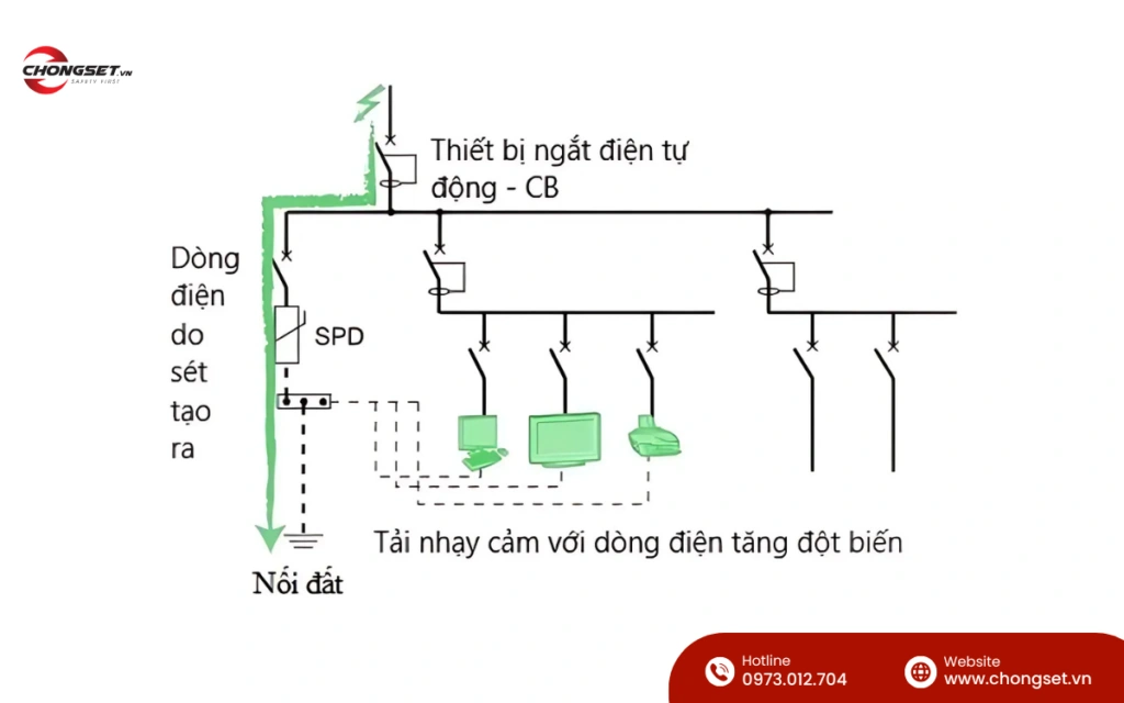 - Thiết bị cắt sét (SPD - Surge Protection Device): Giảm điện áp tăng đột biến do sét.
